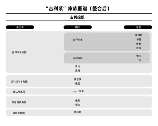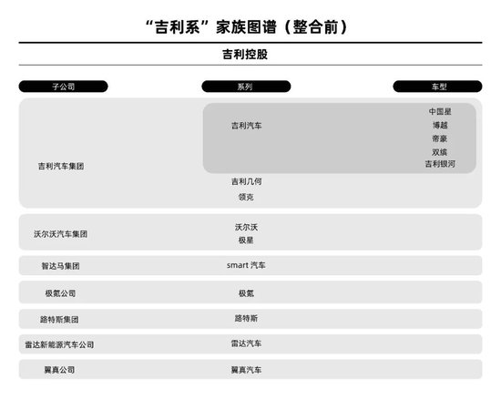 吉利几乎是国内产品线最复杂的车企之一。在本次调整前,整个吉利系共有多达14个汽车品牌,如吉利、几何、领克、极氪、沃尔沃、极星、路特斯、smart、雷达等。有的是自产,有的是通过收购、入股等方式获得。